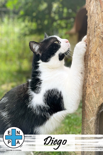 Diego è un gattone stimato 2021, affascinante come solo i bianco-neri sanno essere. Abbandonato davanti al gattile insieme a tanti altri mici, fin da subito si è distinto per la vicinanza che cercava con i volontari, rispetto ai fratelli, molto più spaventati. Dopo il comprensibile spaesamento iniziale, ha dimostrato di adorare le coccole e la compagnia dell’umano. È un gran golosone, un gatto educato e gentile. Venite a conoscerlo, sarete ammaliati dal suo fascino irresistibile!